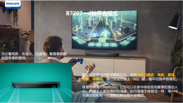 不能親臨現(xiàn)場,只能在家看球賽,球迷們總是缺少了比賽火爆場面的現(xiàn)場感,對很多人而言是一種遺憾。雕琢聲音細(xì)節(jié),利用聲音氛圍帶來現(xiàn)場觀賽的真實感受,飛利浦B7207將為你終結(jié)遺憾。場上球員的“廝殺”聲,現(xiàn)場觀眾的歡呼聲,解說員的激情講解,飛利浦B7207為你盡情環(huán)繞釋放來自現(xiàn)場的各種氛圍聲,輕松體驗強(qiáng)烈的身臨現(xiàn)場的觀賽感。