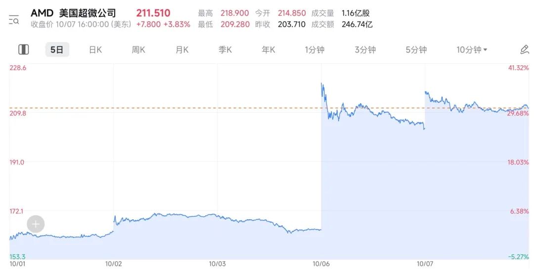消息一出,資本市場瞬間沸騰,AMD的股價在當(dāng)天交易中一度飆升超過34%,最終收漲23.71%,市值一日之內(nèi)激增近800億美元,創(chuàng)下九年多來的最大單日漲幅。